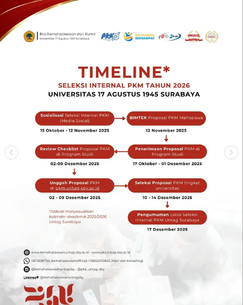 Jangan lewatkan setiap tahap penting di timeline seleksi internal PKM Untag Surabaya.