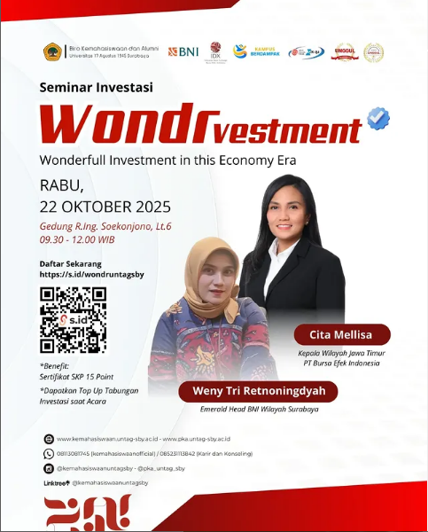 Ayo bergabung di “*Wondrvestment: Wonderfull Investment in this Economy Era*”, seminar investasi kolaborasi Bank BNI dengan UNTAG Surabaya!