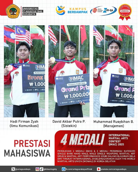 Tiga mahasiswa Untag Surabaya sukses membawa pulang 4 medali internasional yang terdiri dari 2 medali emas dan 2 medali perunggu pada ajang International Martial Arts Contest (IMAC) 2025 di Korea Selatan.