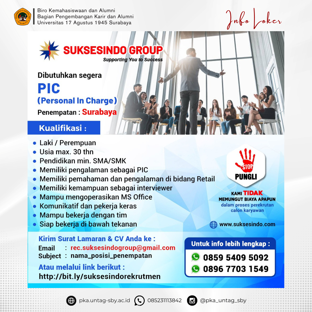 Kategori Posisi : PIC Surabaya - Suksesindo Group