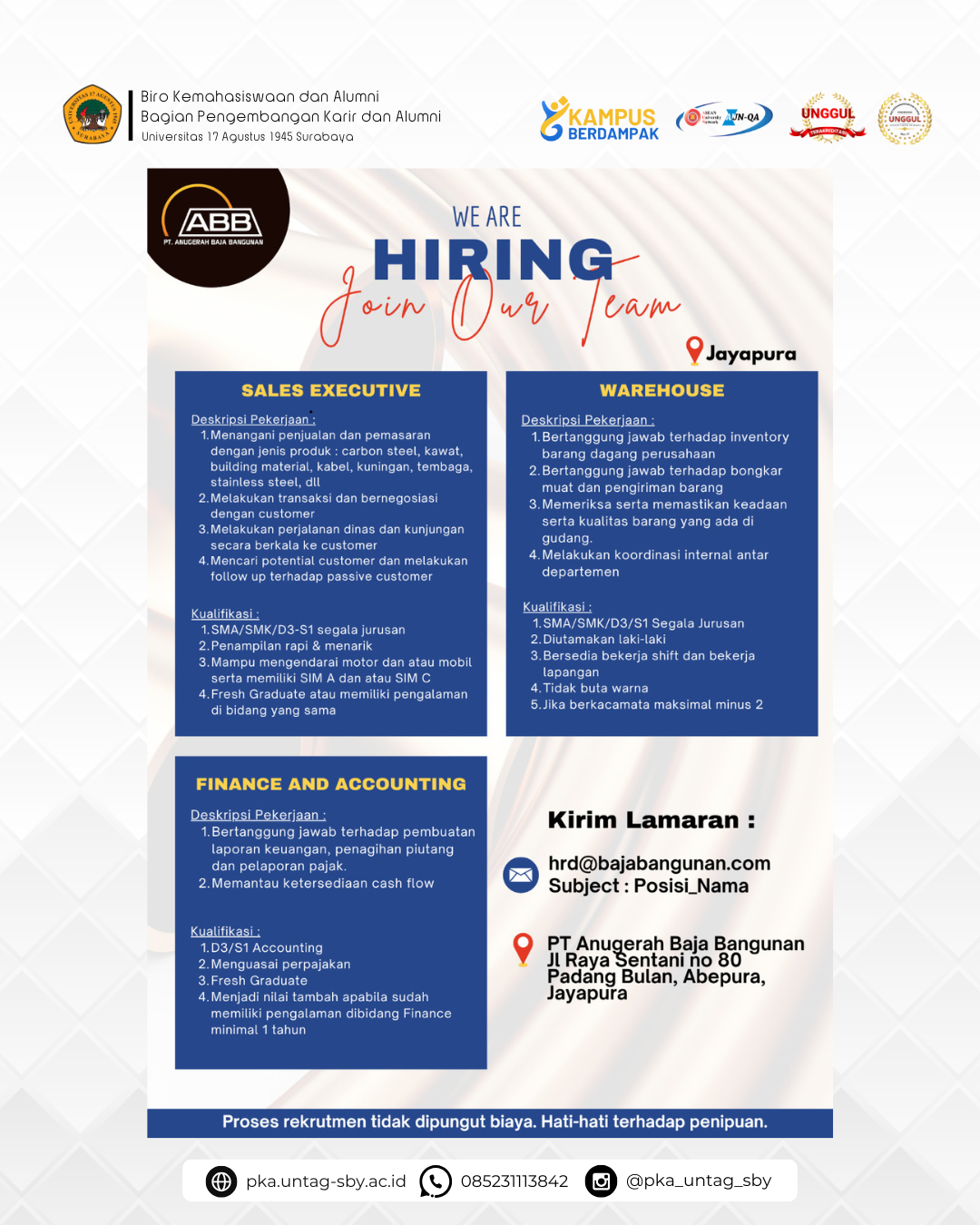 | Isi_Lowongan | : | Sales Executive, Warehouse, Finance & Accounting PT Anugerah Baja Bangunan (Penempatan Jayapura) PT Anugerah Baja Bangunan (disingkat ABB) adalah sebuah perusahaan yang bergerak di bidang konstruksi dan manufaktur baja, yang menjadi bagian dari Anugerah B M Group. Perusahaan ini menyediakan berbagai produk dan layanan yang berkaitan dengan baja, mulai dari baja untuk konstruksi hingga baja untuk keperluan lainnya Bagi Sahabat Untag Career Mattes yang berminat bisa segera melamar sesuai keterangan pada gambar Proses Rekrutmen tidak dikenakan biaya dalam bentuk apapun |
