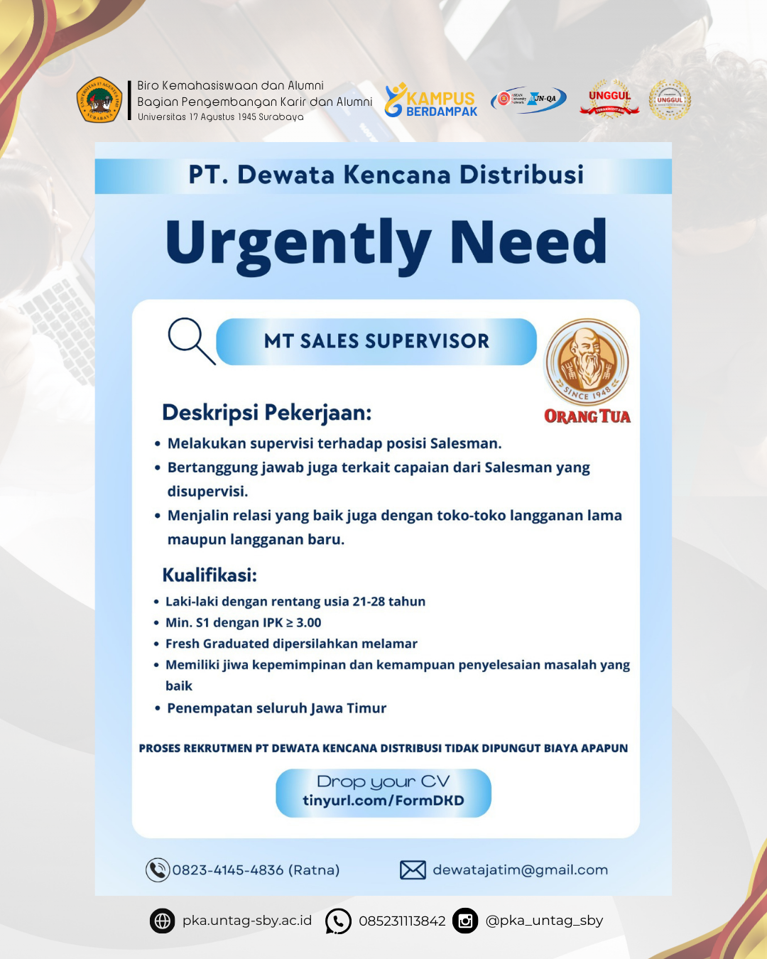 | Judul | : | MT Sales Supervisor PT Dewata Kencana Distribusi | |
