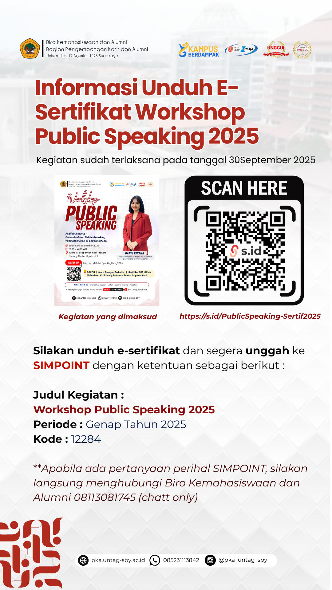 E-sertifikat kegiatan Workshop Public Speaking 2025 yang sudha dilaksanakan pada tanggal 30 September 2025 sudah dikirim ke email. Silakan cek email atau unduh di link berikut.