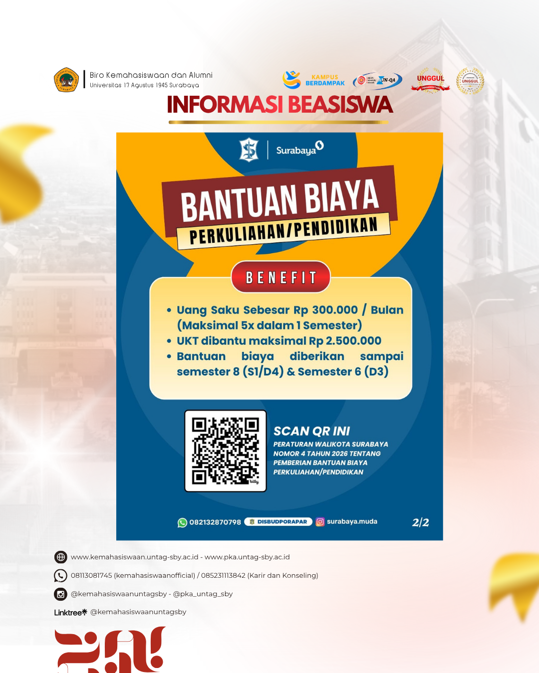 Biro Kemahasiswaan dan Alumni Universitas 17 Agustus 1945 (Untag) Surabaya kembali menginformasikan peluang beasiswa bagi mahasiswa, khususnya warga Surabaya, melalui program Bantuan Biaya Perkuliahan/Pendidikan dari Pemerintah Kota Surabaya Tahun 2026.