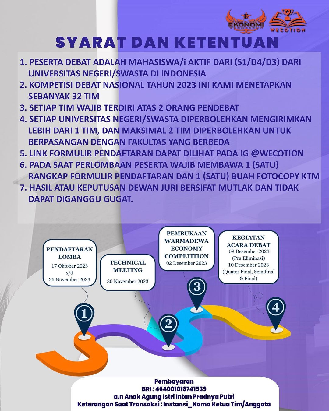 - Pembukaan Warmadewa Economy Competition : 02 Desember 2023 (Wajib Diikuti Oleh Seluruh Peserta Lomba Secara Online).