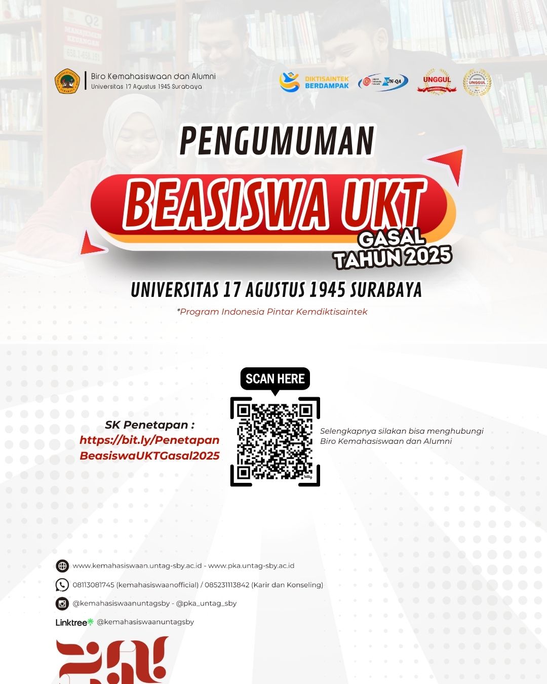 Berdasarkan SK Rektor UNTAG Surabaya nomor 836/SK/R/XI/2025, telah ditetapkan mahasiswa semester 3, 5, dan 7 yang menerima Bantuan UKT/SPP Program Ind... Read More